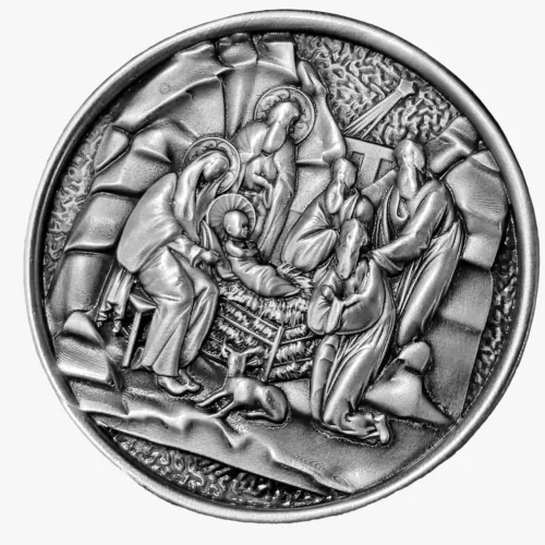 This medal is showing the ‘Adoration of the Magi’, also known as the ‘Adoration of the Kings’, when wise men found baby Jesus by following a shining star, showered him with gifts, and worshiped him.