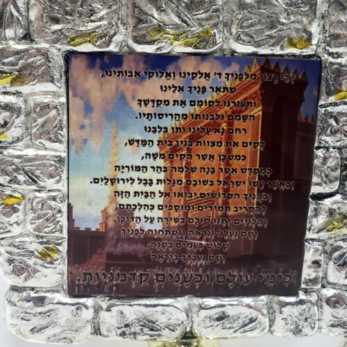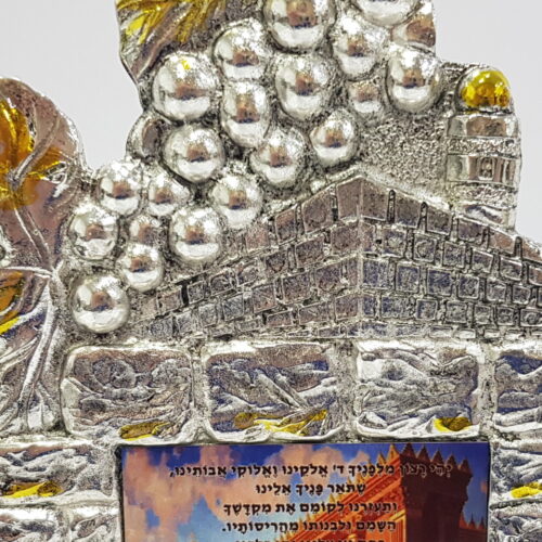 A table decor with of the Jerusalem ancient walls the Tower of David and classic Holy Grapes and inside a quote from the book of Psalms and an image of of the Holy Temple.