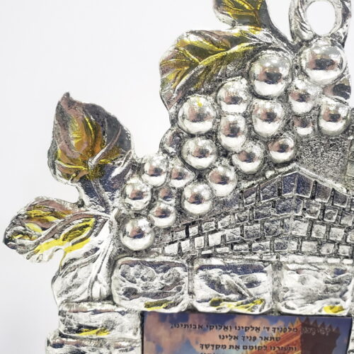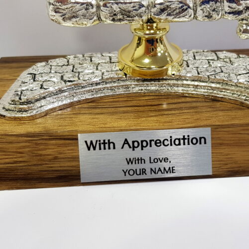 The decor is hand made in Israel of zinc alloy metal and the plating is Sterling Silver 925. The base is a wooden base and on it is a plaque where you can a personal or Holiday greeting.