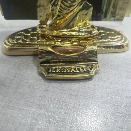 The figurine and Jerusalem inscription are made of zinc alloy metal and are diecast embossed 3D, meaning you can feel them and they are not flat. On its’ base is a capsule with Holy Land soil and on the back frame is made of laser-cut iron.
