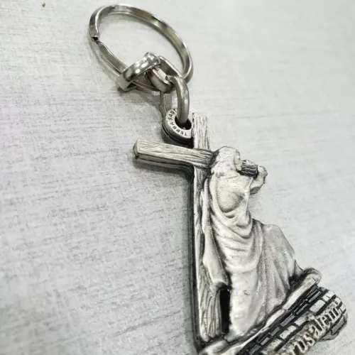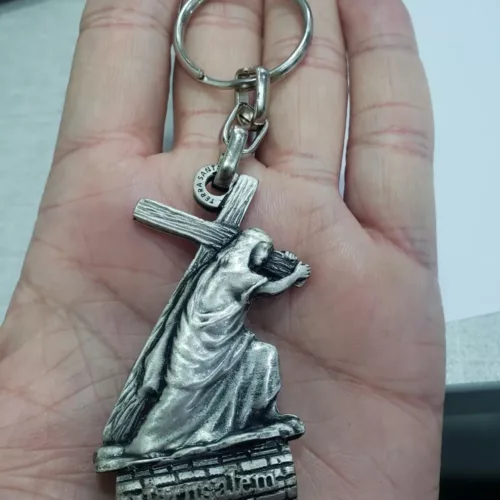 ‘Christ Carrying the Cross’ Jerusalem Keychain. The keychain is made of zinc alloy metal and the plating is STERLING SILVER, graded 925 – aka real silver.