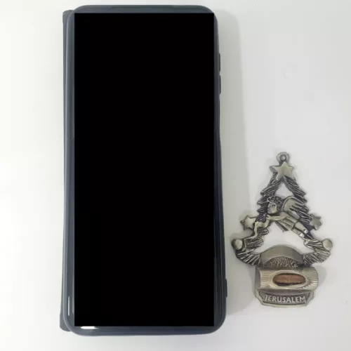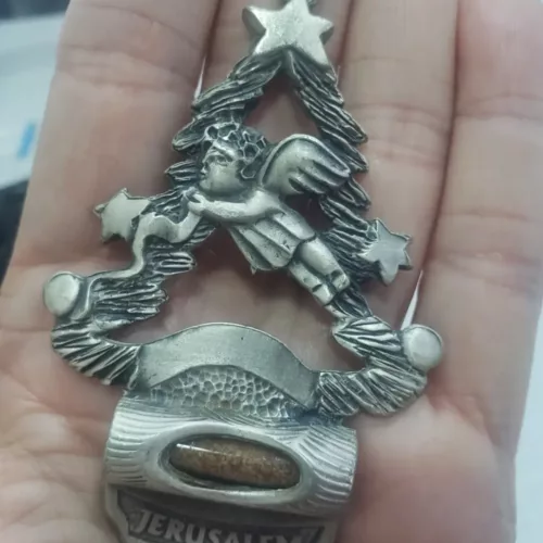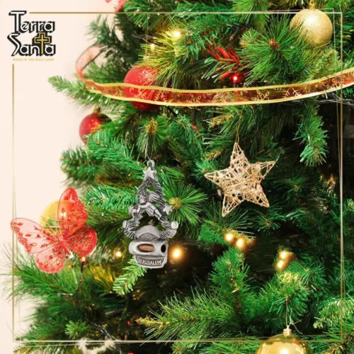 Christmas ornament for the holidays shaped as a Christmas tree, itself and with an angel inside. The ornament is made of zinc alloy metal and plated with Sterling Silver, graded 925 – meaning REAL silver. The charm also includes, over the Jerusalem inscription, a capsule with AUTHENTIC Holy Land Soil inside.