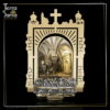 Laser cut Iron Decor stand of Jerusalem city with an image of the ‘Crucifixions Altar in Holy Sepulchre Church’ in Jerusalem with a die cast embossed figurine of Holy Nuns praying, and a capsule of Holy Land soil on its base.