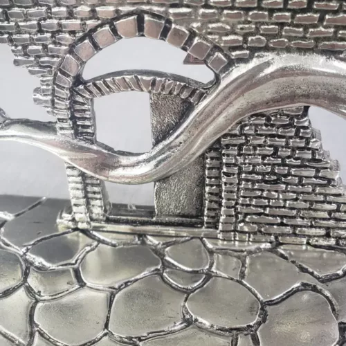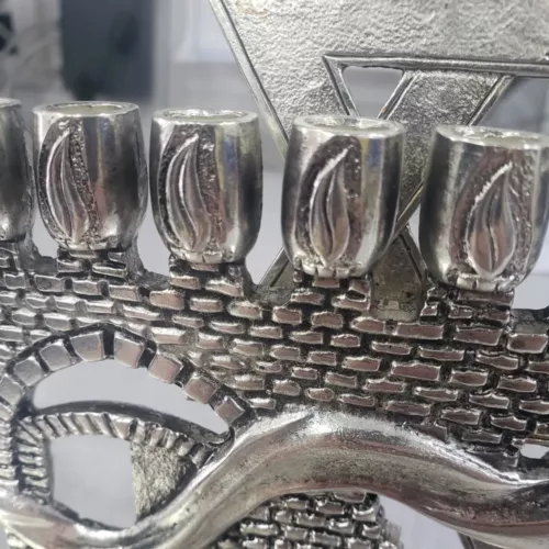 Hanukkah Menorah is embossed as the old city walls of Jerusalem, with the gate, the Tower of David and a shofar across it. The Hannukah Menorah is hand-made in Israel of zinc alloy metal and the plating is STERLING silver 925 – aka real silver.
