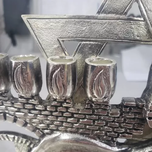 Hand-Made Hanukkah Menorah Jerusalem Walls Gate Shofar Sterling Silver Plating