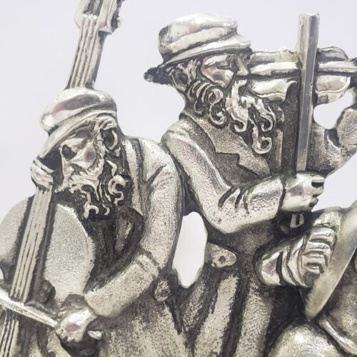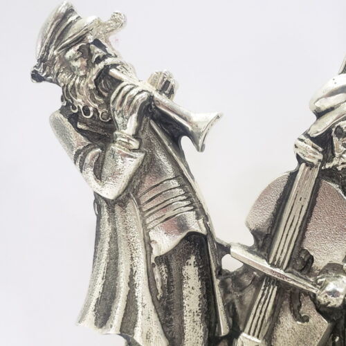 Hanukkah Menorah of historic central European Ashkenazi Jewish dancing musicians, known also Klezmers in Hebrew, playing the cello, trumpet, violin and cymbal. The Hannukah Menorah is hand-made in Israel of zinc alloy metal and the plating is STERLING silver 925 – meaning real silver.