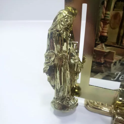 A table decor with figurines of Mary Mother of Jesus and an image is of the front of the Holy Aedicule in the Church of the Holy Sepulchre – the presumed exact location inside the church of the birthplace of Jesus.