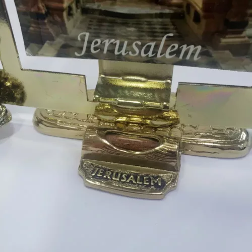 The figurine and base are made of Zinc alloy metal and the plating is sterling silver 925 – meaning real silver. On its base, over the inscription “Jerusalem”, is a capsule with Holy Land soil and the frame of the stand is laser-cut iron and the plating is shiny brass.