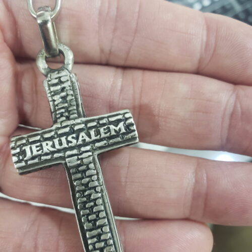 Keychain is shaped as a cross with Jerusalem-like cobblestones on the surface and Jerusalem inscribed on the horizontal bar.