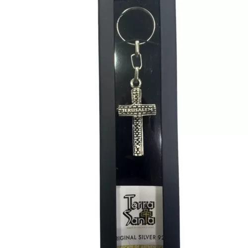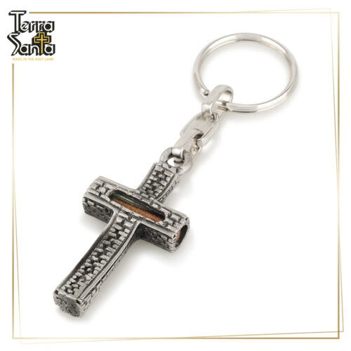 Cross Keychain with Jerusalem inscription Sterling Silver Plated & Holy Land Soil