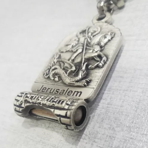 The image itself is diecast embossed, meaning it’s 3D and you can actually feel it when touching it. At the bottom, over the Jerusalem inscription, is AUTHENTIC holy land soil in a capsule. The ring hook is made of rugged stainless steel.