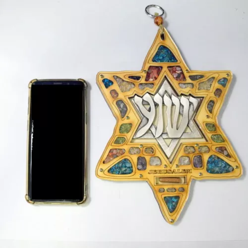 The art decor is made of Birch wood, the ישוע figurine is made of zinc alloy metal and the plating of the figurine is STERLING SILVER, graded 925. The decor itself includes inner carves with a beautiful mosaic of colorful deep river semi-precious stones inside of them and at the bottom, over the Jerusalem inscription, is a capsule with authentic Holy Land Soil. The hook ring and bolts are made of strong stainless steel and the wood and carvings are covered with a layer of perspex to protect them from the elements.