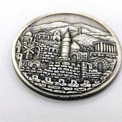Ancient Jerusalem walls medal with the kind David tower, famous windmill, an old temple (upper left), and other structures of the old city.
