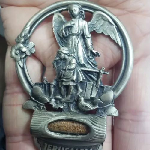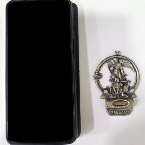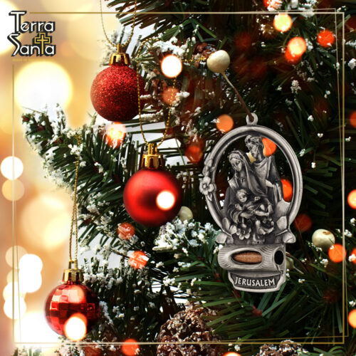 The Christmas ornament is made of zinc alloy metal and plated with Sterling Silver, graded 925. The ornament includes a capsule with Holy Land Soil over the Jerusalem inscription.