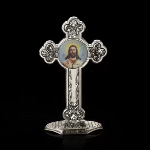 Orthodox Christian table cross with an image of Our Lord. The crucifix is diecast embossed meaning it’s 3D and you can feel it, it’s not flat, and made of zinc alloy metal and the plating is sterling silver 925. On its base of it, over the inscription ‘Jerusalem’ is a capsule with AUTHENTIC Holy Land soil.