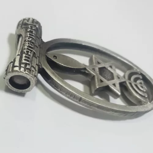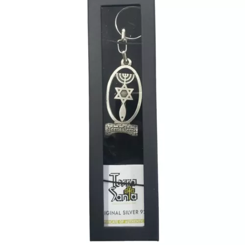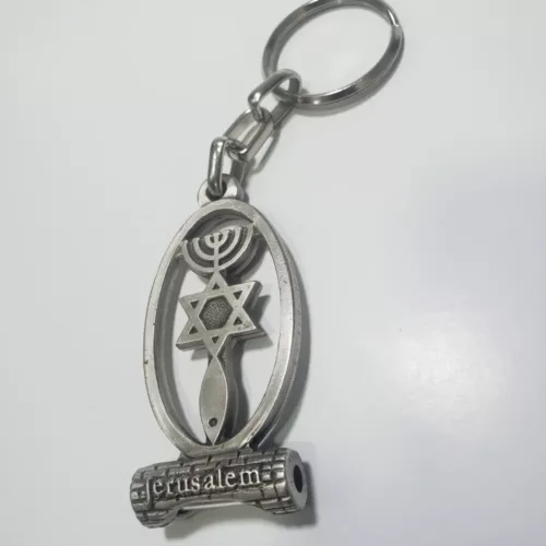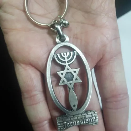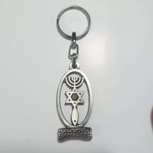 An Evangelical Keychain with Jesus Fish Ichthy’s, Star of David and a Menorah and made of zinc alloy metal and plated STERLING SILVER – graded 925 (aka real silver). The Jesus fish – Itchy’s – was the early Christian symbol before early Christians started using the Cross, after the 4th century.