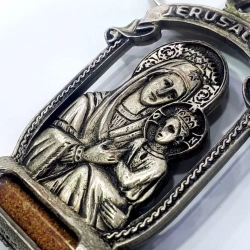 Mary & Baby Jesus Jerusalem Keychain – Zinc, Sterling Silver Plating & Holy Land Soil