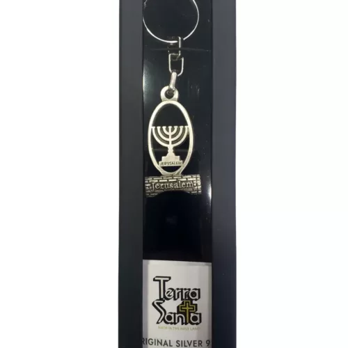 Menorah Jerusalem Keychain – Made of Zinc & Sterling Silver Plated with Holy Land Soil