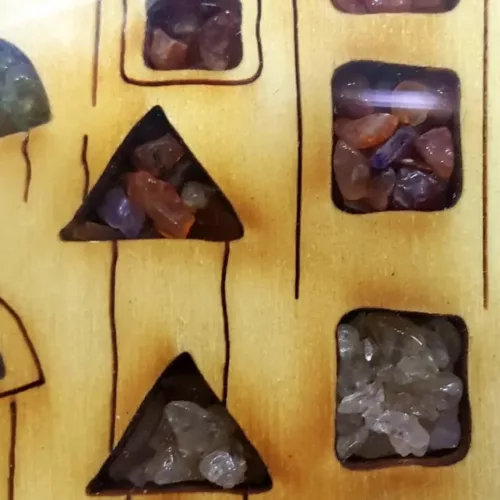 The wall art decor is made of Birchwood and figurine is zinc metal and the and the plating is STERLING SILVER, 925. The decor itself includes inner carved squares with beautiful colorful deep river semi-precious stones and at the bottom a capsule with authentic Holy Land Soil. The hook ring and bolts are made of rugged stainless steel.