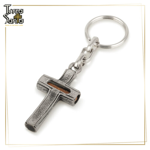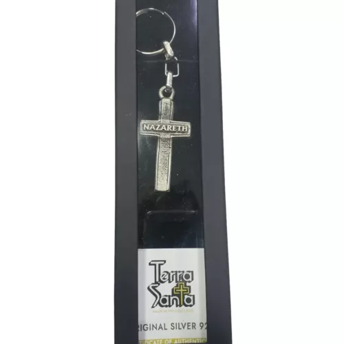 Cross Keychain with Nazareth Inscription, Sterling Silver Plated & Holy Land Soil