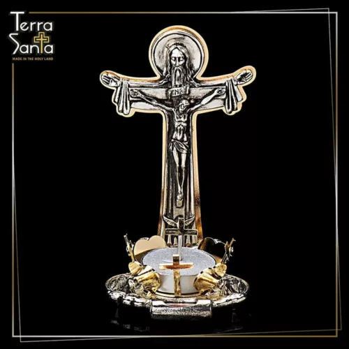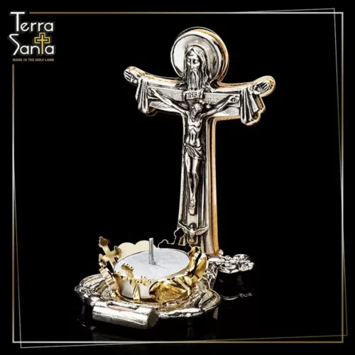 Jerusalem ‘GOD ALMIGHTY” INRI – “Jesus, king of the Jews (abbreviations in Latin) – table standing crucifx. The crucifix is made of zinc alloy metal and the plating is STERLING SILVER, graded 925. The zinc is diecast embossed, hence it’s 3D, and you can actually feel it when touching it. On its base is a candle and a capsule with REAL Holy Land soil in it. The back frame of the crucfix and candleholder are made of laser-cut Iron and the plating is shiny brass