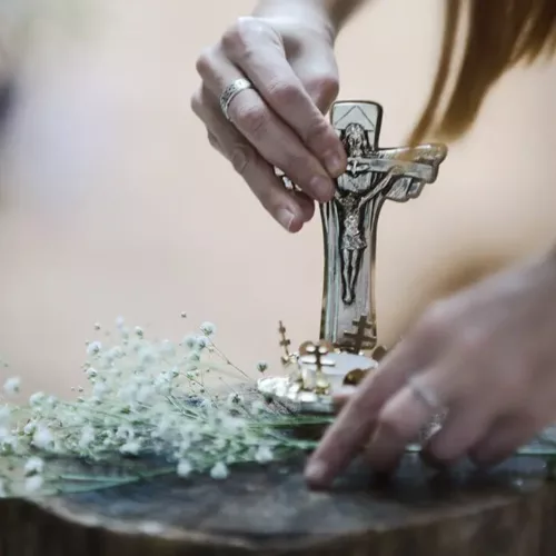 At the base of the crucifix is a capsule with real Holy Land soil and the frame laser cut iron and the plating is shiny brass.