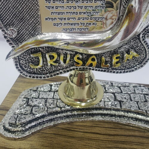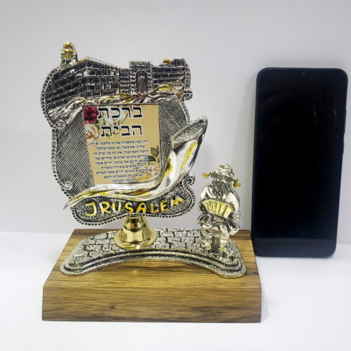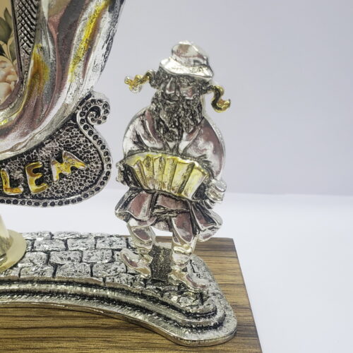 On top of the decor is an image of the Jerusalem walls and gates and on its a Jewish Klezemer – Jewish dancing musician – with an accordion. The decor is on a wooden base and on it you can add a personal greeting.