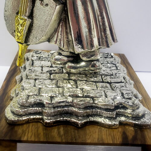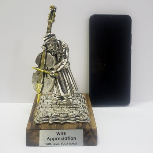 A table decor statue of a Hassidic Jewish dancing cello musician, called Klezmer, common in the classic 19th century Eastern European Shtetl, Jewish communities and villages. The decor is hand-made in Israel of zinc alloy metal and the plating is sterling silver 925. On its wooden base, you can add a plaque with a personal greeting or a few words as a gift.
