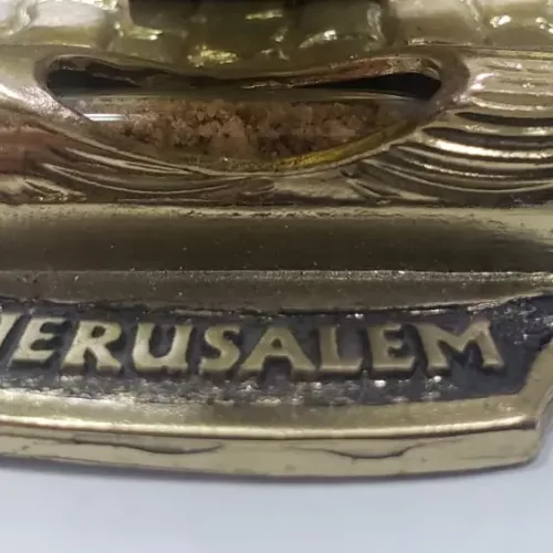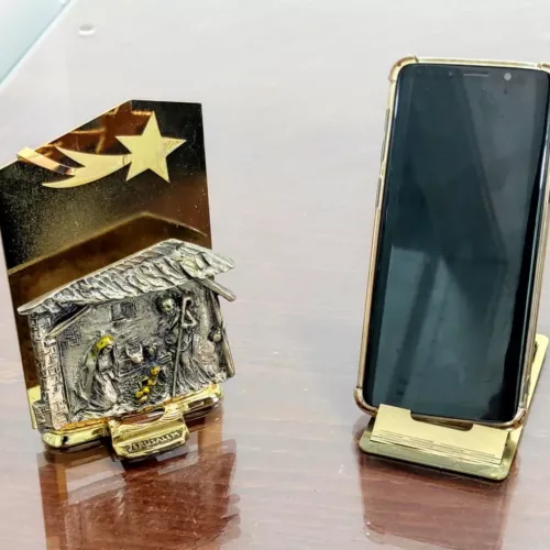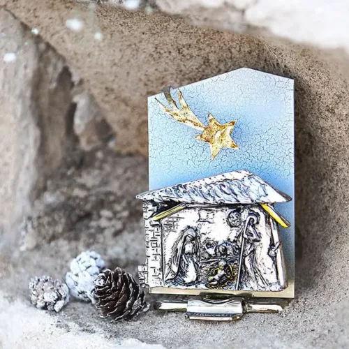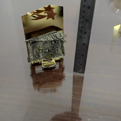 ‘Star of Bethlehem’ table decor with a figurine of the ”Nativity Scene” – Jesus’s birth in the gospel of Matthew. The figurine is hand-made in the Holy Land and made of premium zinc alloy metal and the plating is STERLING SILVER 925 – aka real silver. The figurine is 3D diecast embossed – meaning you can feel it, it’s NOT just a flat image. At the bottom is a capsule with AUTHENTIC Holy Land soil and the frame of the stand itself is made of laser-cut iron.