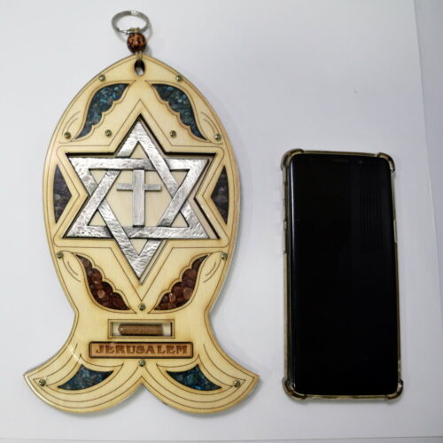 Ichthys ‘Fish’ wall art decor, or “sign of the fish” or “Jesus fish“, with a figurine of the Star of David and cross inside. The Jesus fish was a secret symbol during Roman times in which early Christians used to identify Churches when they were illegal.