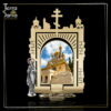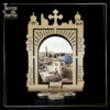 Soporte decorativo de hierro cortado a láser de la ciudad de Jerusalén con una cruz ortodoxa y una imagen del camino de la «Vía Dolorosa» y una figurita de Cristo en relieve fundida a presión que lleva la cruz, con una cápsula de tierra de Tierra Santa en su base.