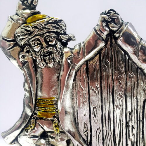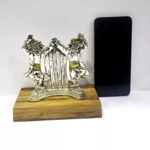 A table decor statue of Hassidic Jewish dancing musicians, called Klezmer, which were common in the classic 19th century Eastern European Shtetl, Jewish villages. The decor is hand-made in Israel of zinc alloy metal and the plating is sterling silver 925 and on a wooden base.