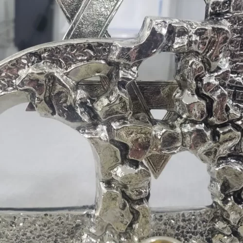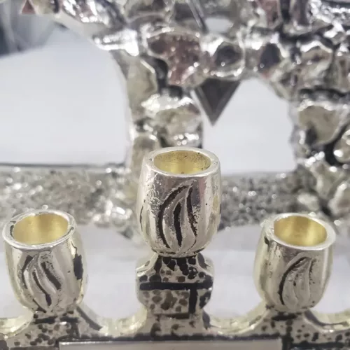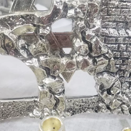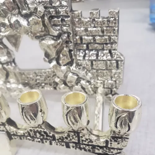 Menorá de Hanukkah com uma imagem da cidade velha de Jerusalém – especificamente a Torre de Davi em Jerusalém – e atrás dela a Estrela de Davi judaica. A Torre de Davi é uma seção fortificada das muralhas da cidade velha de Jerusalém, que foi construída principalmente na Idade Média. A Menorá de Hannukah é feita à mão em Israel com liga metálica de zinco e o revestimento é de prata STERLING 925 – também conhecida como prata verdadeira.
